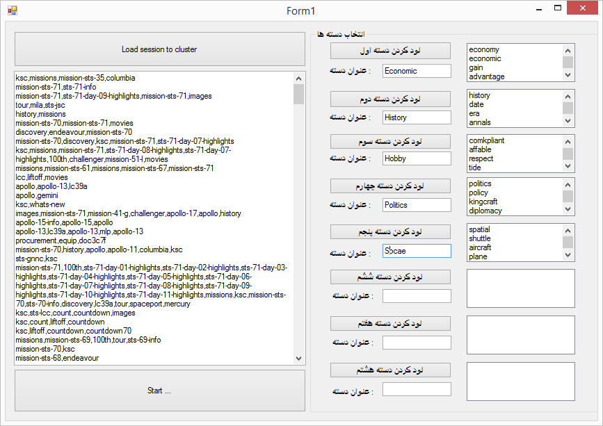 مثال: ما هزار عدد نشست داریم، سه دسته به نام های ورزشی، اقتصادی و سیاسی در نظر می گیریم، برای هر کدام از این سه دسته کلمات مناسب را از فایل مربوطه که در این پکیج وجود دارد در سیستم لود می کنیم. (بعد از خرید از راهنمای فارسی استفاده کنید). سپس با لود کردن نشست ها و اجرای برنامه تمام محتویات (صفحات)یکتای این هزار نشست در سه دسته اقتصادی و سیاسی و ورزشی دسته بندی می شوند.