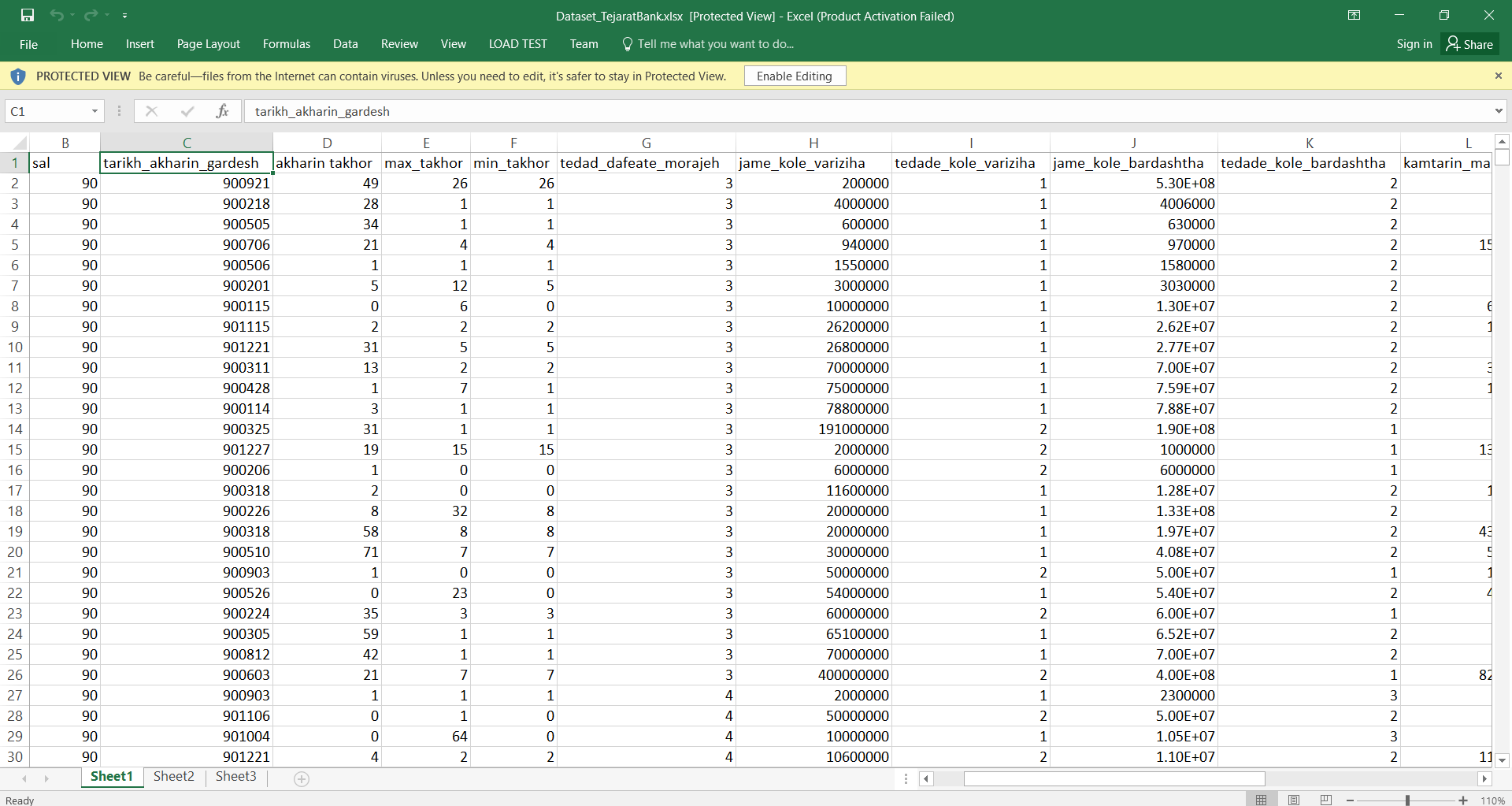 محتوای محصول: تعداد ۲۰۰۰ رکورد از اطلاعات حساب ها و اطلاعات Aggregate شده با توجه به آخرین گردش مشتریان از بانک تجارت ایرانتصویر دیتاست :راهنمای ستون ها : سالتاریخ آخرین گردشآخرین تاخرحداکثر تاخرکمترین تاخرتعداد دفعات مراجعهجمع کل واریزی هاتعداد کل واریزی هاجمع کل برداشت ها تعداد کل برداشت ها کمترین مانده بیشترین مانده تعداد کل خدمات کل تراکنش های غیر حضوریآخرین مانده ارزش مشتری: ۱ با ارزش و صفر بی ارزش