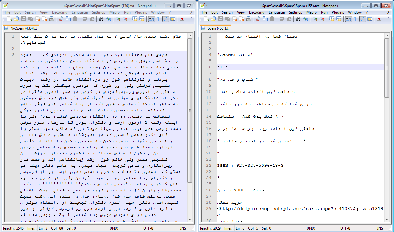 محتوای محصول : دیتاست فارسی اسپم استاندارد به همراه مدارک اثبات استاندارد بودن آن – این دیتاست حاوی ۵۰۰ عدد ایمیل اسپم و ۵۰۰ عدد ایمیل غیر اسپم می باشد. متن به فارسی می باشد و مناسب تمامی دانشجویان به منظور تشخیص متون فارسی در تشخیص اسپم می باشد.